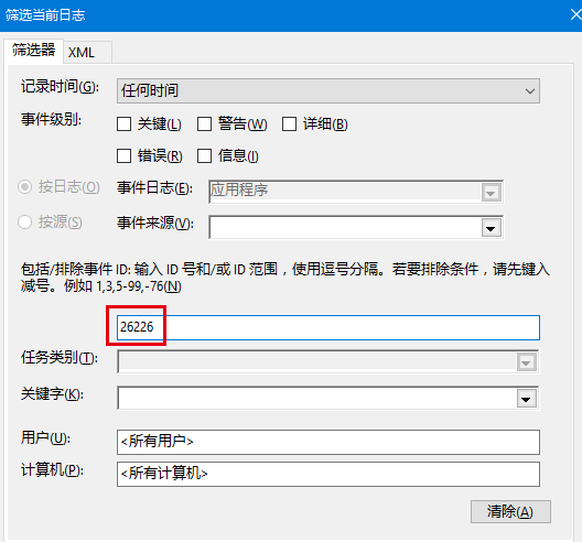 3、在窗口正中间一行输入事件ID“26226”,点击“确定”,如下图——