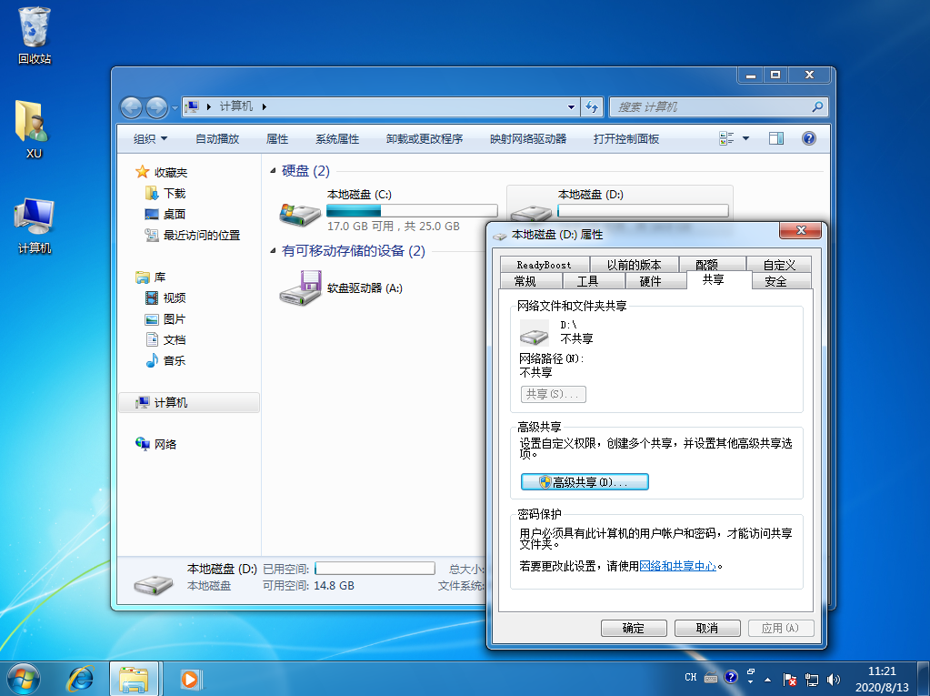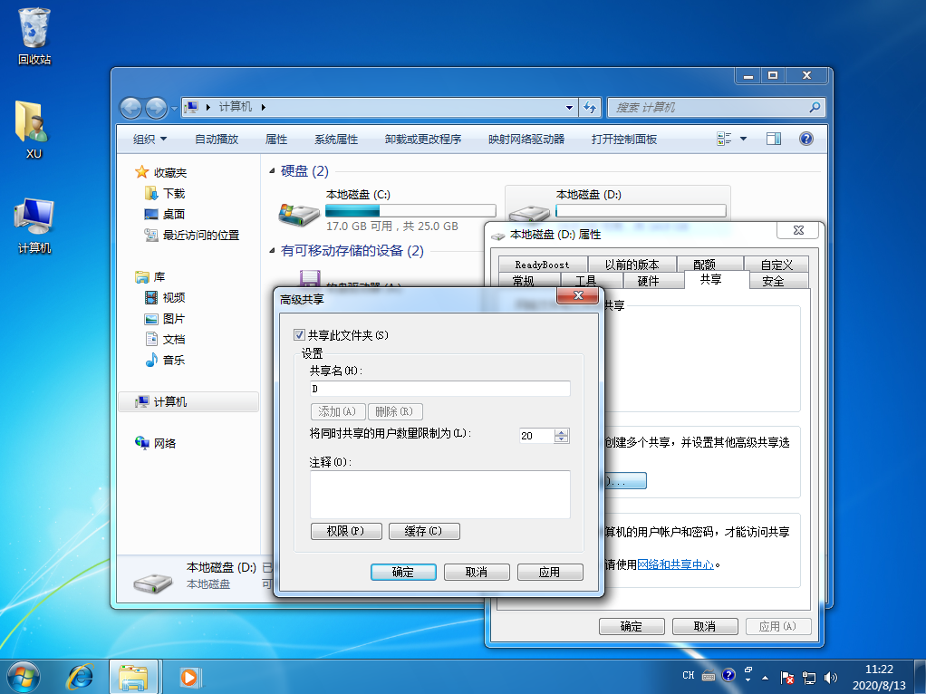 4、设置完成后保存修改即可。如果您之前有设置过,以上的步骤可以省略。打开计算机,选择 D 盘,右键属性,在属性中选择共享选项。然后打开高级共享选项。