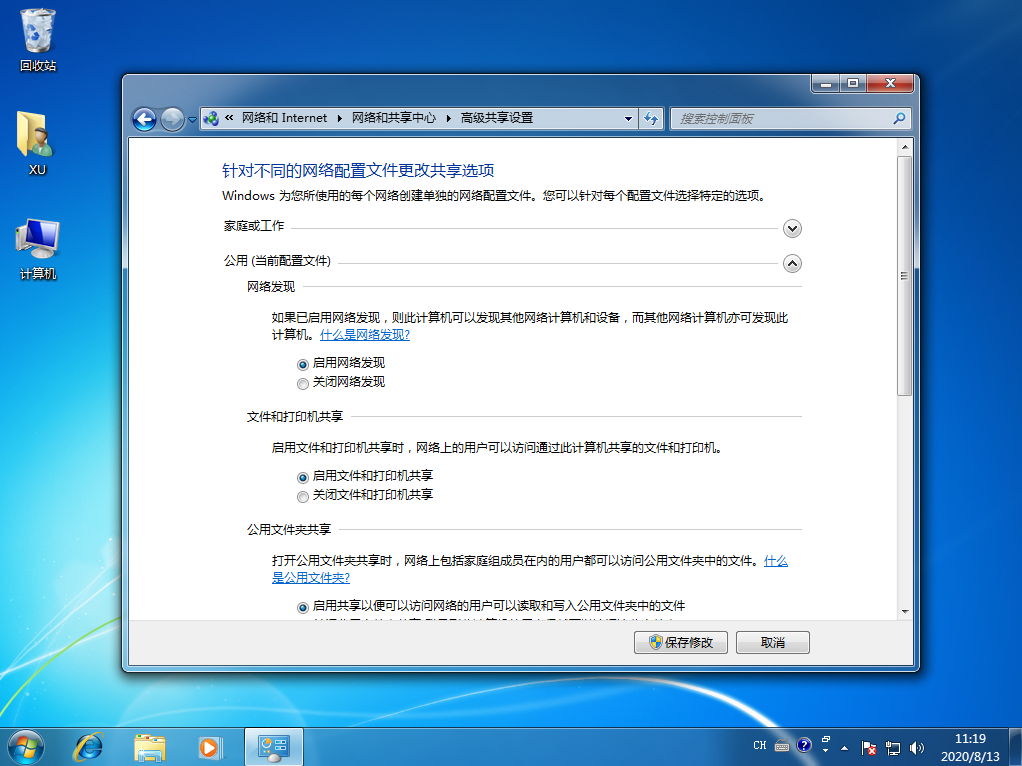 3、选择更改高级共享设置...选项,在选项中分别启用网络发现、启用文件和打印机共享、启用共享以便可以访问网络的用户可以读取和写入公用文件夹中的文件。