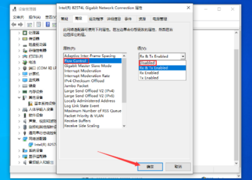 最后,找到“FLOW control”,在值中选择“Dissbled”,再按下“确定”按钮。