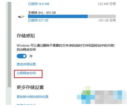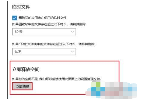 6、然后我们返回到上一个页面,在存储感知下面有一个立即释放空间,鼠标单击,即可对c盘进行清理。