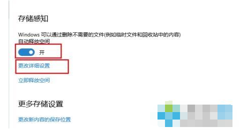 4、然后我们将储存感知按钮打开,它可以自动清理。在鼠标点击更改详情设置。