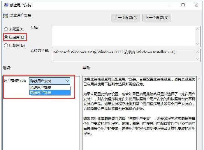 3、双击“禁止用户安装”进入设置界面,将“禁止用户安装”启用,然后设置成“隐藏用户安装”。