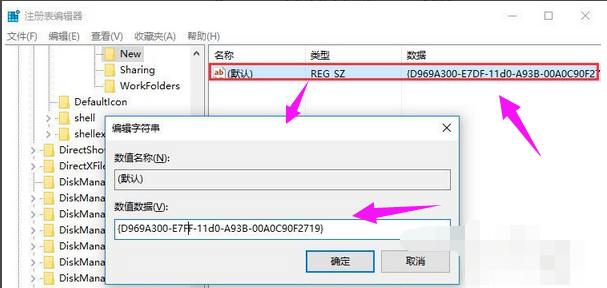 第四步,在New对应的右侧窗口,(默认)的值是:{D969A300-E7FF-11d0-A93B-00A0C90F2719},如果不是,则左键双击:(默认),在弹出的编辑字符串的对话框中,把数值数据更改为:{D969A300-E7FF-11d0-A93B-00A0C90F2719},再点击:确定
