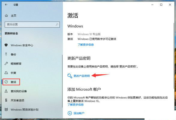 3、更新和安全主页设置窗口中,点击左侧的激活,然后点击更改产品密钥;