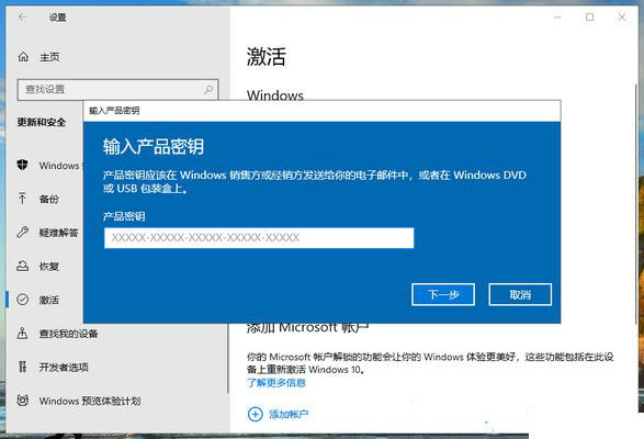 4、如果需要从家庭版的win10升级到专业版的win10(其他版本也类似),可以输入相应的产品密钥,只要产品密钥正确,就可以转换win10版本了;