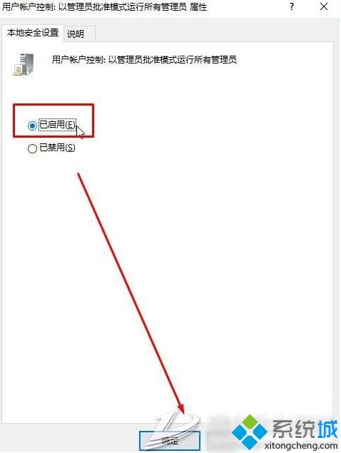3、在右侧双击打开“用户账户控制:以管理员批准模式运行所有管理员”,选择“已启用”,点击确定,并重启计算机即可解决。