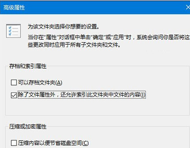 3、在高级属性界面将之前选中的“除了文件属性外,还允许索引此文件夹中文件的内容”点击取消然后再重新选中他,最后点击【确定】按钮。