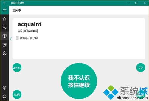 6、在点击并按住的过程中,圆形按钮会变成时钟的样式开始计时;如果计时结束时使用者仍未确定是否认识这个单词,那圆形按钮上的文字将会变成“我不认识”,同时在窗口左下角出现“认识”的按钮。