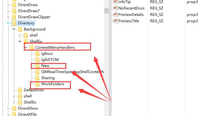 3.除了【new】和【WorkFolders】文件夹,删除【ContextMenuHandlers】中的所有文件夹。