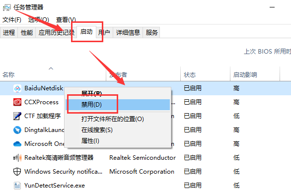 3. 启动任务管理器,点击 【启动】 选项卡,将所有启动项都禁用。重启设备即可。