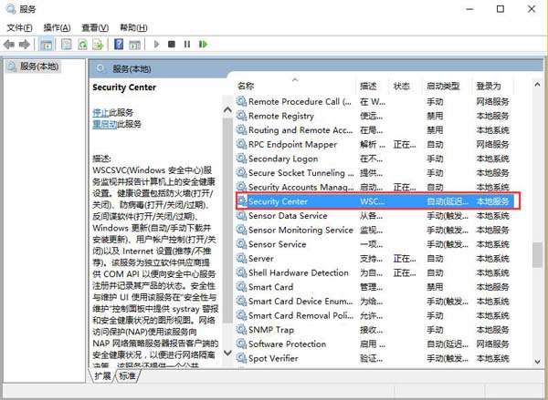 2、调出服务窗口后,在服务列表内找到Security Center服务,然后将其双击打开,如图所示: