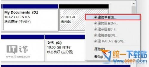 ▲ 在未分配空间上右键单击,选择“新建简单卷”,再出现的窗口中一路点击“下一步”即可。注意,如果提示你需要将硬盘转换为动态磁盘,那是因为你的硬盘是MBR分区结构,主分区数量已经超过了该分区类型的最大限制——4个,此时请放弃分区操作。