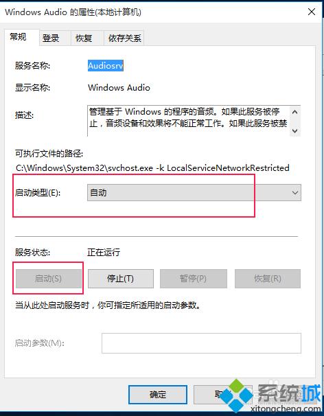 3、双击打开Windows Audio服务的属性 ,点击“启动”按钮启动服务,如果开机启动该服务,可以将“启动类型”设置为自动。要关闭服务,点击“停止”按钮停止服务,如果开机不启动此服务,可以将“启动类型”设置为“禁用”。