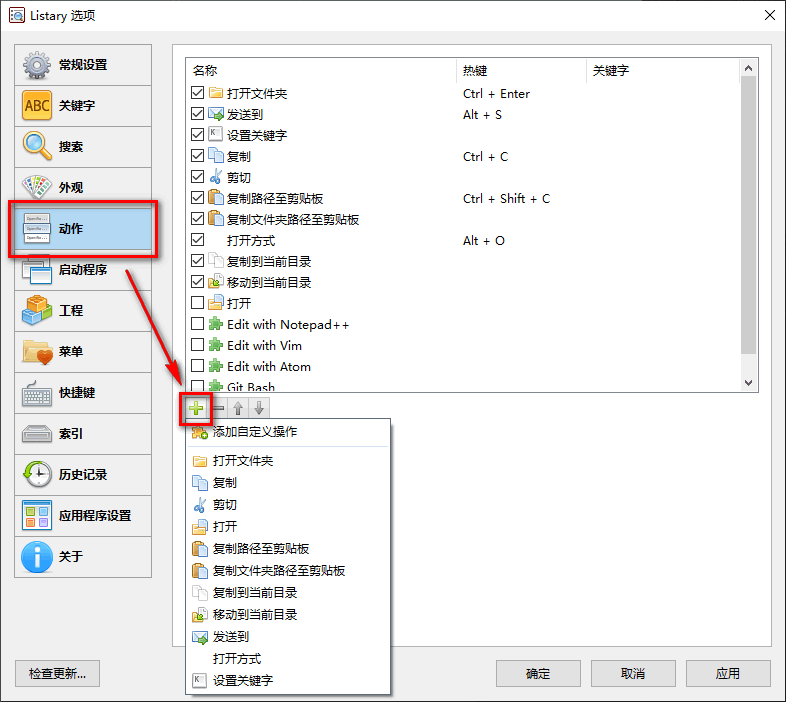 Listary选项中内容非常多,我们不用一点点剖析,涉及到的部分单拎出来看就好了。与上面“动作”相关的选项,就在“动作”选项卡中,我们可以选择启动/取消某一个动作,操作前面的复选框即可,也可以添加或者删除某个动作,以及进行排序,部分动作是需要相应软件支持的。