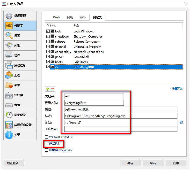 而真正和命令行密切相关的,都在最后的“自定义关键字”中,可自定义的项目非常丰富,关键字、显示名称、描述、工作目录等,最重要的是路径和参数,只要你的需求和想象力够丰富,自定义关键字几乎可以和Web关键字一样,有无限的发挥空间。而且运行命令行时还可以选择“静默操作”,不用打开cmd窗口即可完成操作。