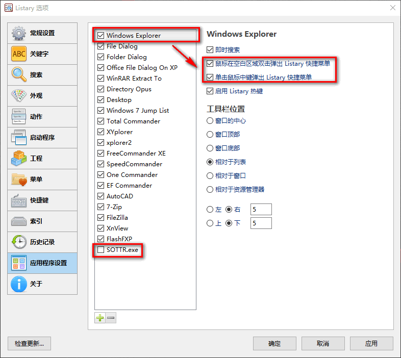 开发者也想到了这个问题,在“Listary选项”中可以设置在哪些场景下禁用Listary,还可以单独设置双击鼠标左键或单击滚轮。在“应用程序设置”选项卡中,可以设置在某个应用程序中是否启用Listary,若要禁用直接取消选中前面的复选框即可。点击引用程序,可以分别设置是否开启双击鼠标左键或单击滚轮的功能。如果想禁用Listary的应用程序不在列表中,只要点击左下角添加,取消选中复选框即可。