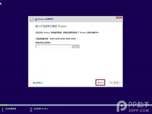 安装过程中出现下面两个画面时,跳过密钥输入即可。