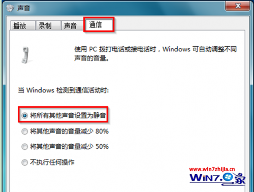 2、在弹出来的声音窗口中,切换到“通信”选项卡下,然后用户可以根据自己的需要来点选“将所有其他声音设置为静音”或者“将其他声音的音量减少80%”或者“将其他声音的音量减少50%”,选择好在之后就点击确定保存退出即可;