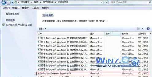 3、然后在展开的卸载更新列表中,找到并右击“windows Internet explore9”选择卸载即可,卸载之后就会还原为之前的ie版本了哦,很简单吧。