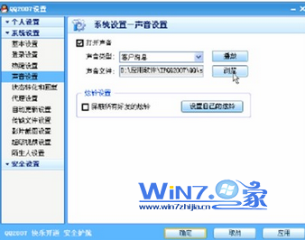 2、然后点击左侧的“声音”选项中,在声音类型下来列表中选择需要的更改文件类型,比如“客户消息”,然后通过“浏览”按钮定位到刚添加到sound文件夹的音频文件;