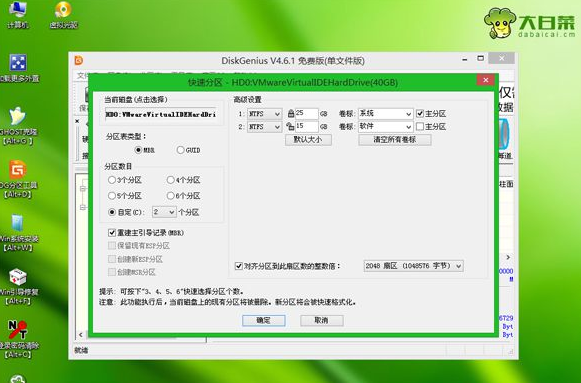 5、设置分区数目和分区的大小,一般C盘建议35G以上,如果是固态硬盘,勾选“对齐分区”即可4k对齐,点击确定,执行硬盘格式化以及分区过程;