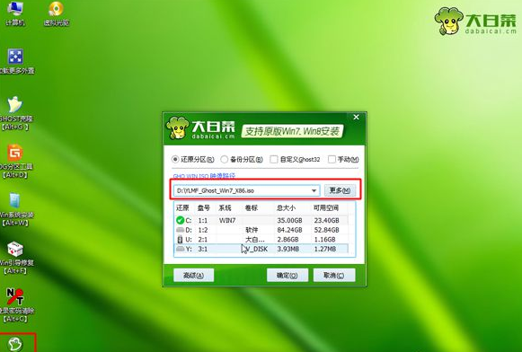 6、完成分区之后,打开【大白菜一键装机】,映像路径选择win7系统iso镜像,此时会自动提取gho文件,点击下拉框,选择gho文件;