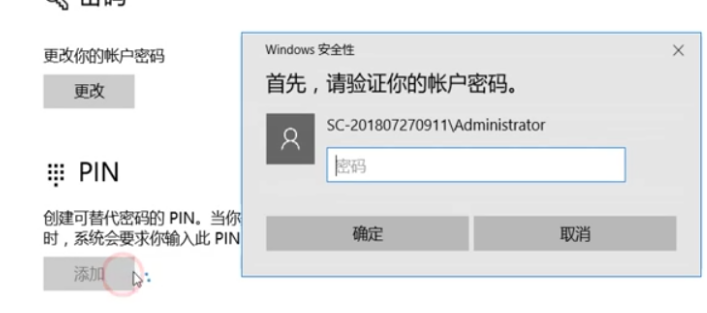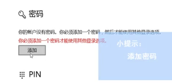 4.在【PIN】下方点击【添加】,输入刚刚添加的账户密码,点击【确定】,然后设置PIN码即可。