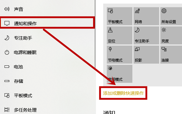 4.然后点击左侧的【通知和操作】选项,在右侧界面点击【添加或删除快速操作】选项
