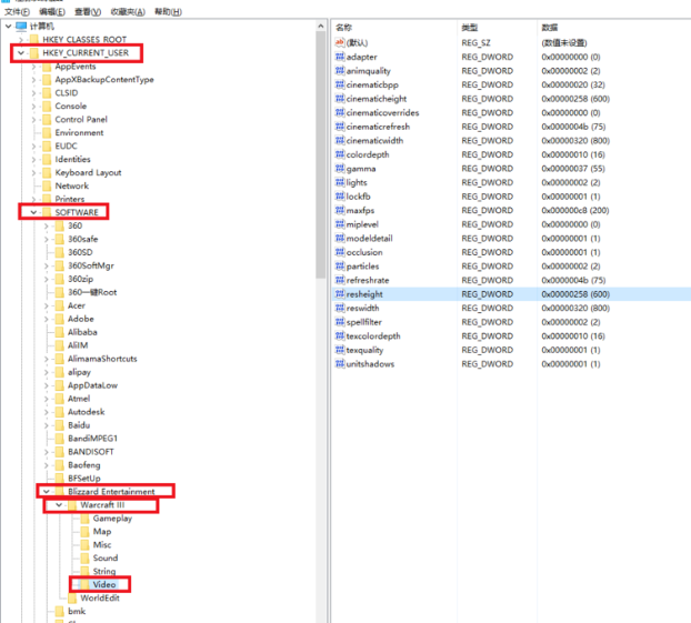 3、之后跳出“注册编辑表”对话框,依次逐个找到“HKEY_CURRENT_USERSoftwareBlizzard EntertainmentWarcraft IIIVideo”。