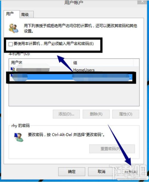3:需要登录账号密码:打勾,“要使用本计算机,用户......”,在点击“应用”,就需要填账号跟密码就ok。