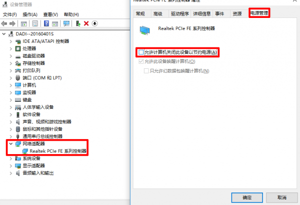 在设备管理器中找到网卡驱动,右键属性,点击电源管理,关闭“允许计算机关闭此设备以节约电源”。