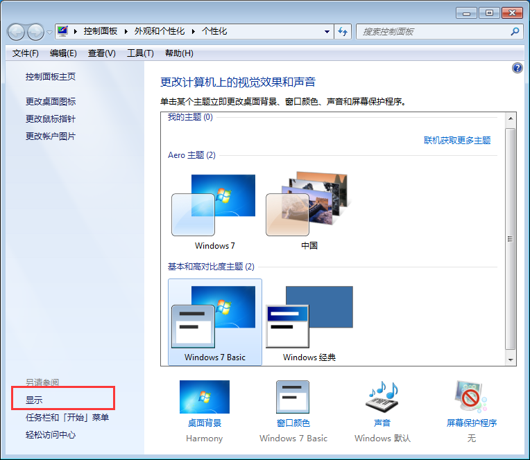 WinWin 7中,您可以通过“个性化”轻松找到清除类型设置。在弹出的“个性化”对话框中,我们可以个性化系统的视觉效果和声音。单击左侧边栏下部的“显示”按钮,系统将弹出下一个选项卡。
