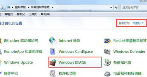 2、将界面的右上角【查看方式】,修改为【大图标】,找到【Windows防火墙】,双击打开。