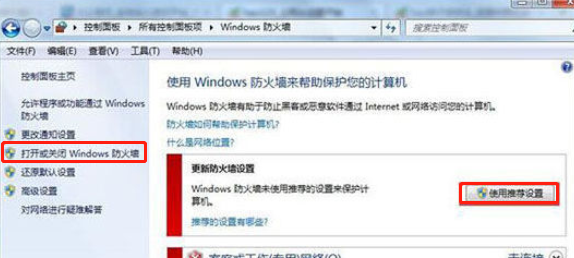 3、在左侧的工具栏中找到【打开或关闭Windows防火墙】,在右侧选择【使用推荐设置】。