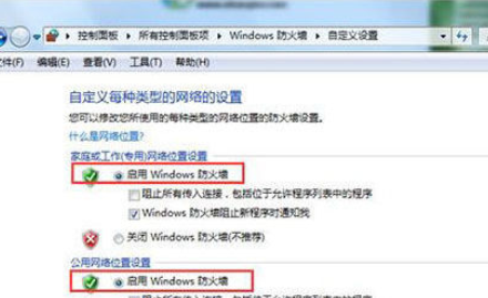4、找到【家庭或工作网络位置设置】和【公用网络位置设置】,将下方的【启用Windows防火墙】点击选中,完成设置。