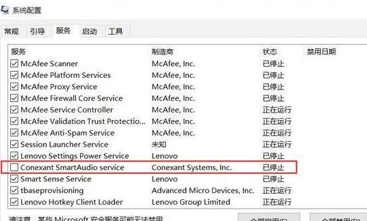 2、系统配置窗口后,切换至服务选项卡,找到Conexant SmartAudio Service,将前面的勾选取消。