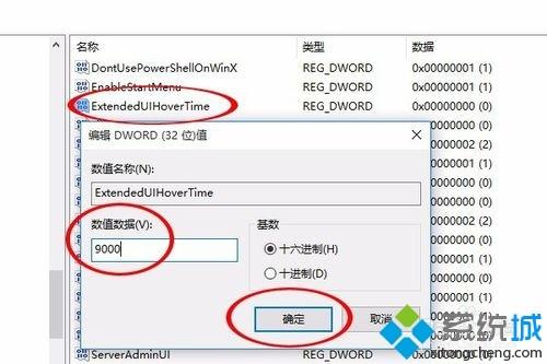 3、单击选中“Advanced”,找到名为“ExtendedUIHoverTime”的DWORD值并双击,打开“编辑DWORD(32位)值”窗口,将数值数据修改为9000,单击“确定”;