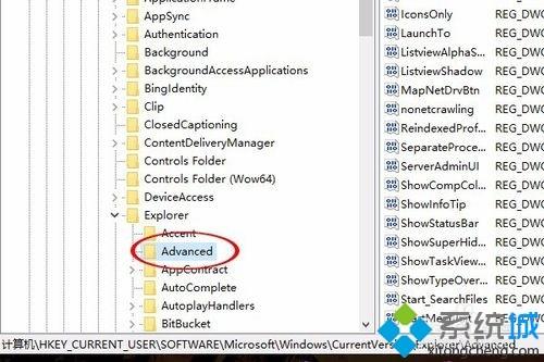 2、在注册表中找到HKEY_CURRENT_USERSOFTWAREMicrosoftWindowsCurrentVersionExplorerAdvanced;
