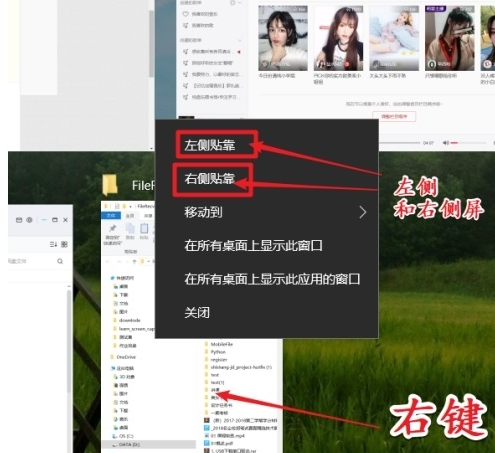 4、然后直接想要的任务窗口,左侧贴靠或右侧贴靠。这是分屏功能实现的手段。