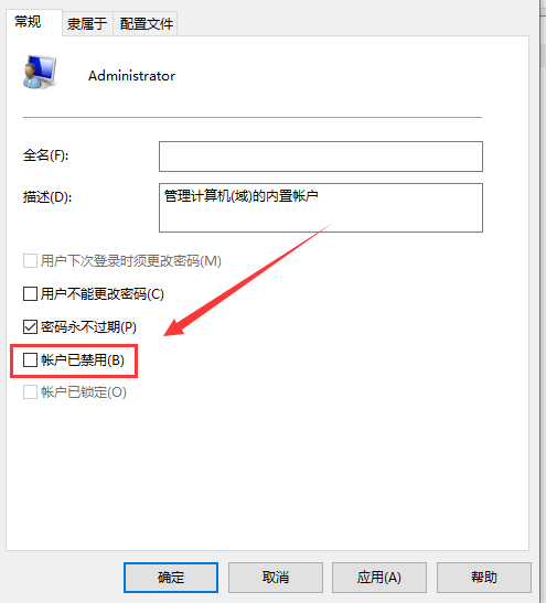 3、在Administrator属性界面中,取消勾选“帐户已禁用”,点击确定即可