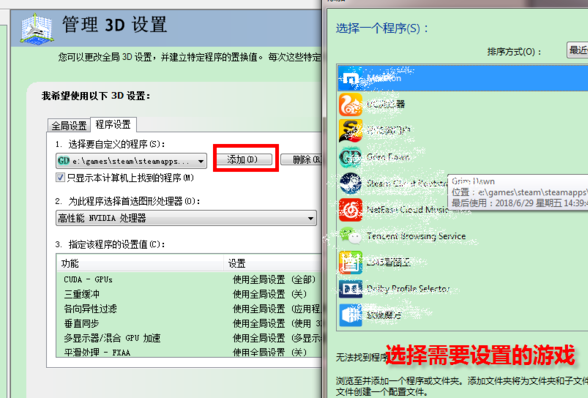 6、点击添加选项,选择我们需要设置的游戏或程序。如果找不到就点击右下角的浏览选项,自己选择游戏去添加。