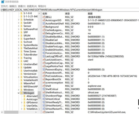 2、在左侧依次找到HKEY_LOCAL_MACHINESOFTWAREMicrosoftWindows NTCurrentVersionWinlogon,Windows 10新版可以直接用该地址访问直达。