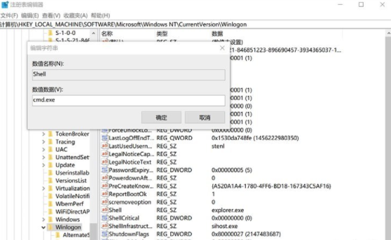 3、在右侧的列表找鼠标右键点击shell,把数值改为“cmd.exe”,修改完成后点击确定。原数值是explorer.exe。