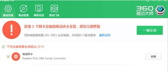 2、待扫描结束后,会自动识别本机中的网卡驱动型号,检测到网卡缺失;