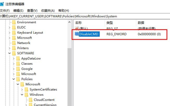 4、新建的这个DisableCMD值默认为0,保持该数值就行.再运行cmd试一下