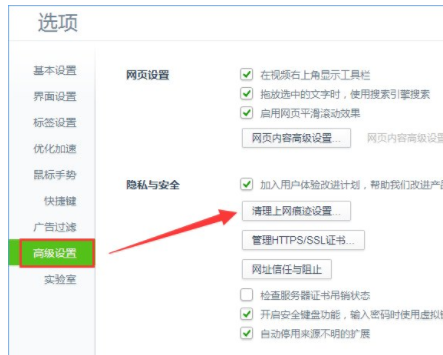 2、点击“高级设置”-“清理上网痕迹设置”;