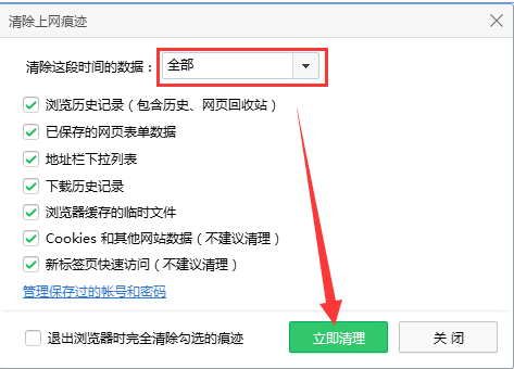3、勾选全部选项,将清除这段时间的数据设置为“全部”,点击“立即清理”即可。