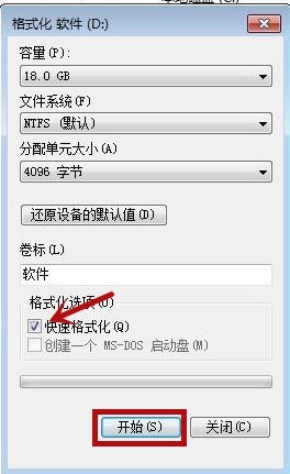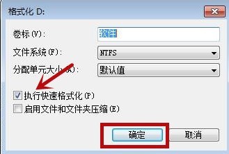 2、接着在打开的格式化窗口中设置保持默认,将【快速格式化】勾选,点击【确定】
