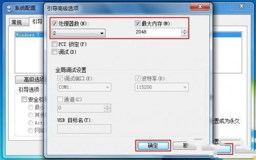 将“处理器数”勾选并选择为“2”,然后再把“最大内存”勾选(系统自动识别当前用户使用的内存大小)单击“确定”。